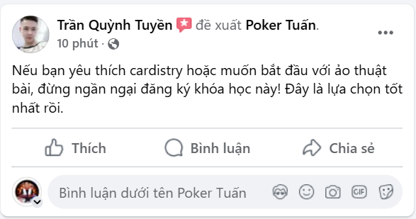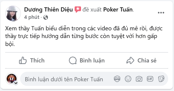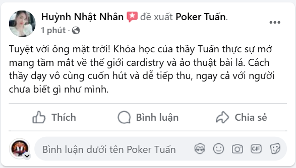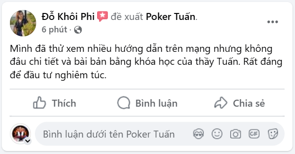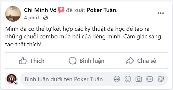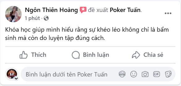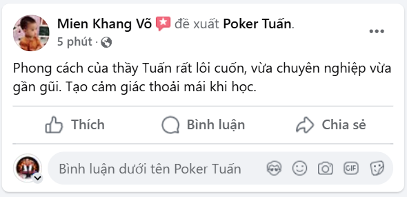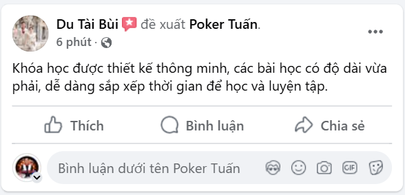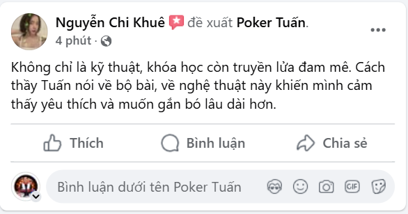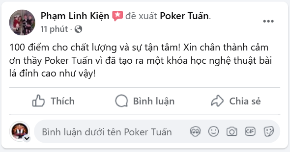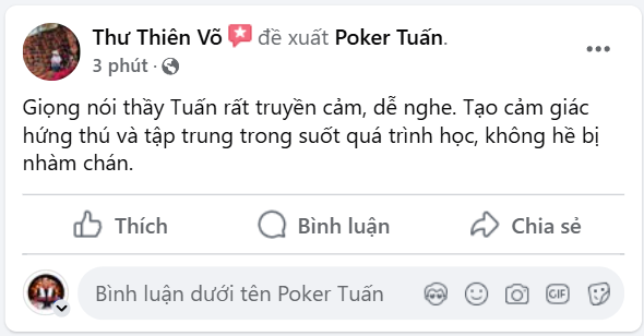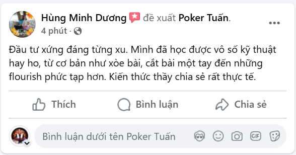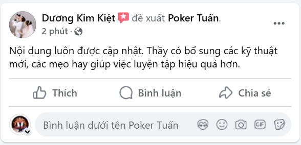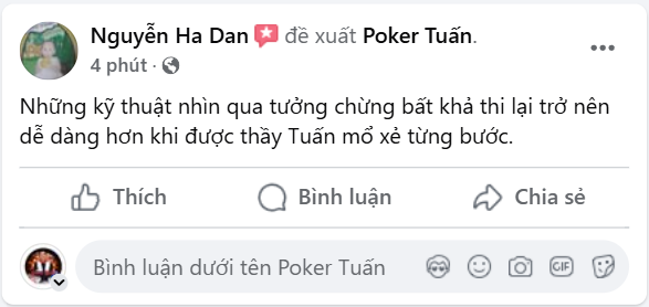 Ngoài ra, học viên thường được tham gia vào cộng đồng những người cùng đam mê, nhận được sự hỗ trợ, phân tích hand và giải đáp thắc mắc liên tục từ Thầy và trợ giảng, giúp quá trình học tập và tiến bộ hiệu quả hơn. Cách truyền đạt dễ hiểu, tập trung vào ứng dụng thực tế cũng là một lợi thế lớn.